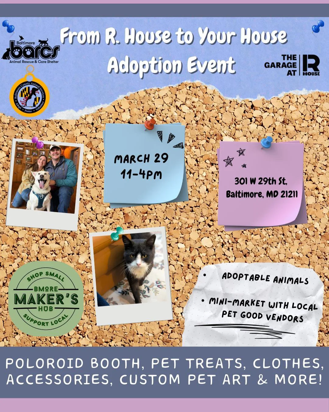 From R. House to Your House Adoption Event Sunday, March 29, 2026 12:00 PM 6:00 PM R. House 301 West 29th Street Baltimore, MD, 21211 United States (map) Google Calendar ICS